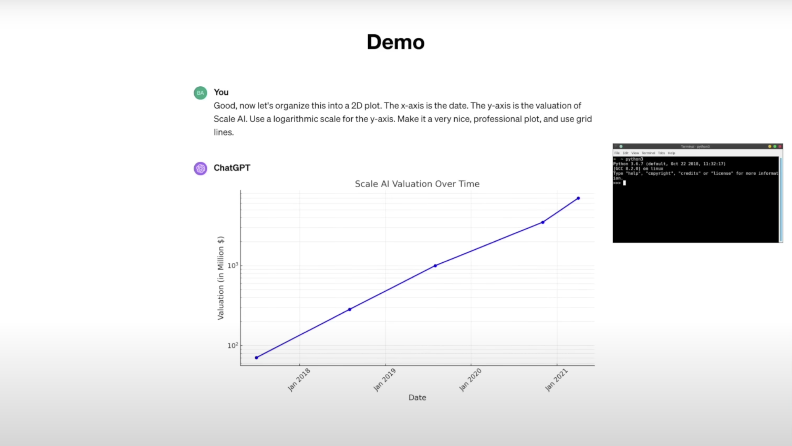 Prompt: Good, now let's organize this into 2D plot. The x-axis is the date. The y-axis is the valuation of Scale AI. Use a logarithmic scale for the y-axis. Make it a very nice, professional plot, and use grid lines.