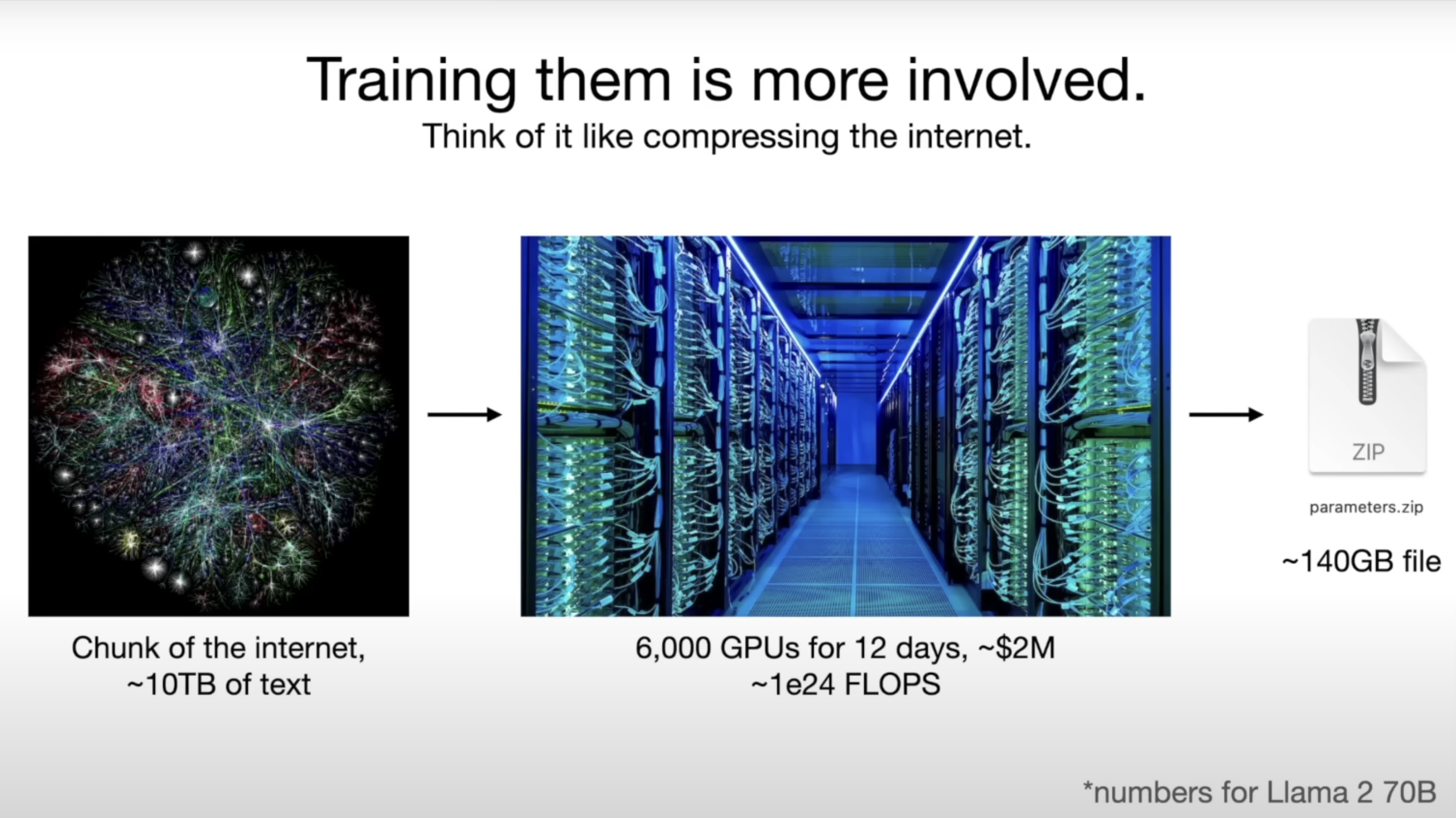 - 2个文件即可以概括LLM的核心,1个是模型权重,另一个是运行在此之上的程序