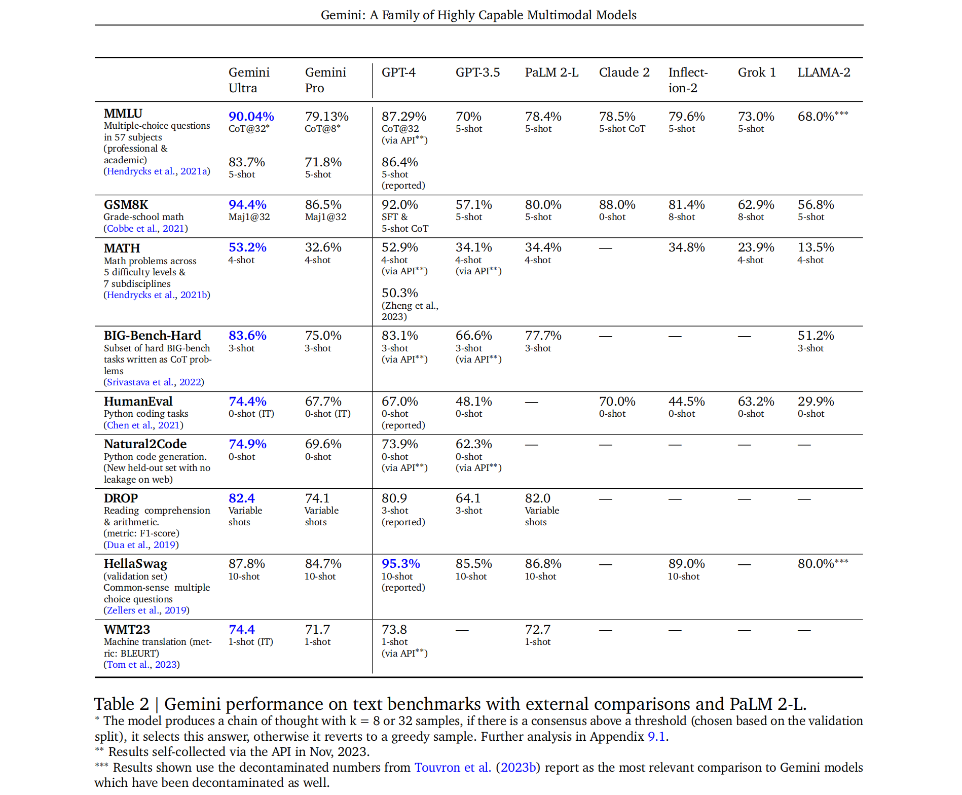 On MMLU: using COT@32 (32 samples) to show that Gemini is better than GPT-4 seems forced. In 5-shot setting, GPT-4 is better (86.4% vs. 83.7%).