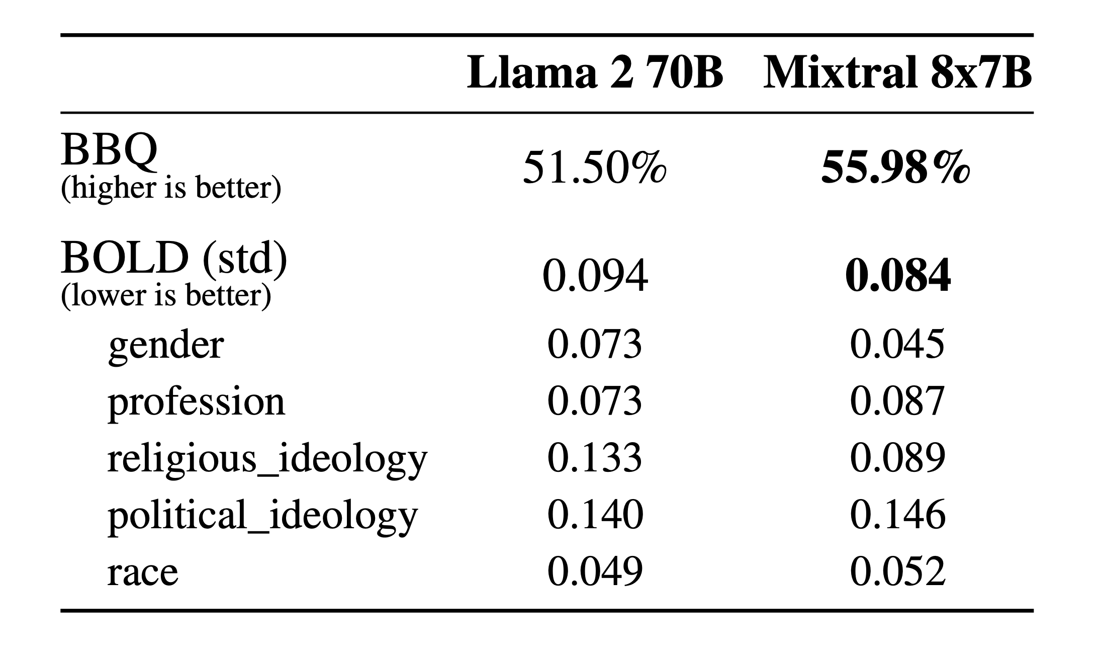 Compared to Llama 2, Mixtral presents less bias on the BBQ benchmark. Overall, Mixtral displays more positive sentiments than Llama 2 on BOLD, with similar variances within each dimension.