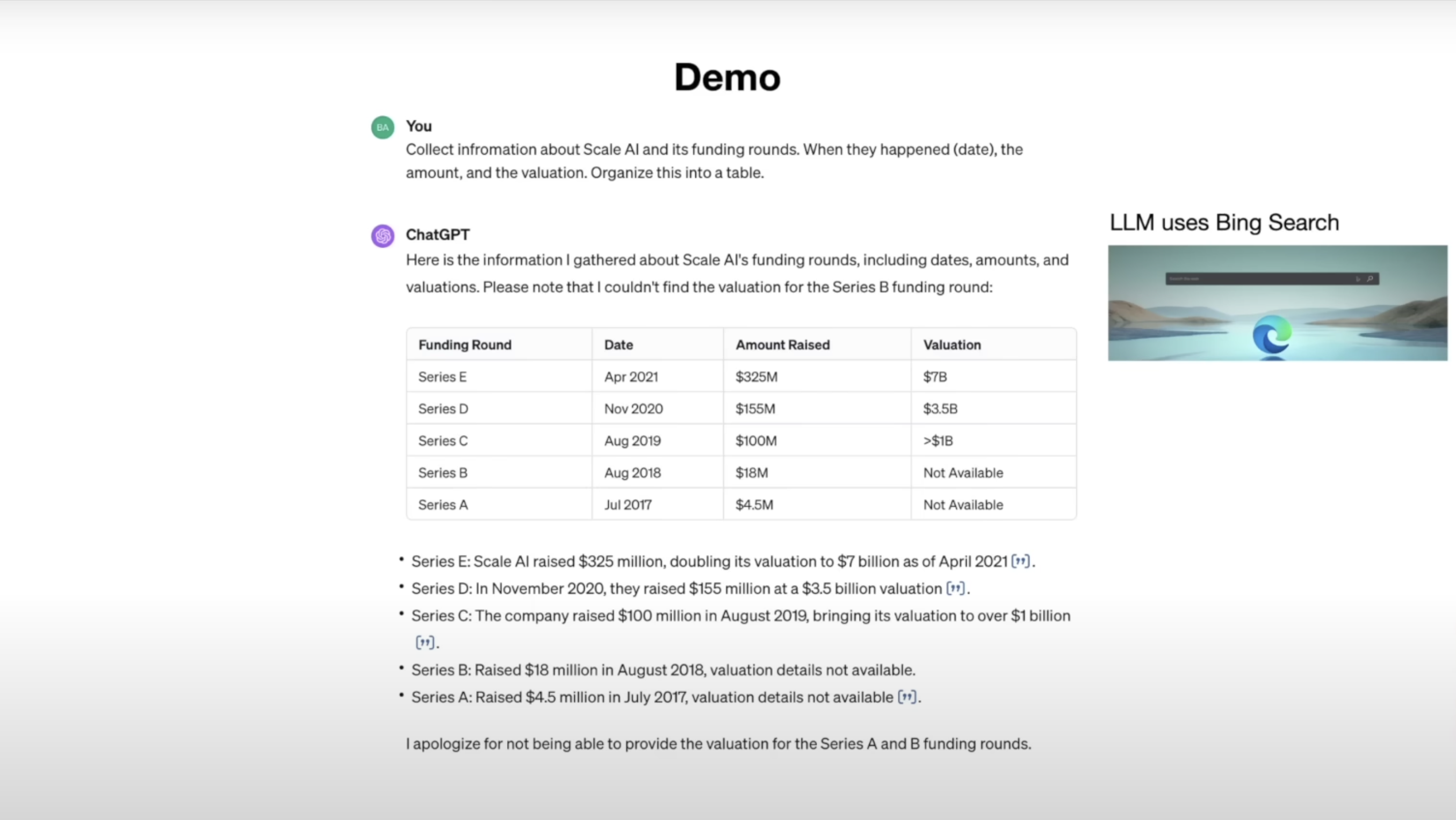 • Prompt: Collect information about Scale AI and its funding rounds. When they happened (date), the amount, and the valuation. Organize this into a table.