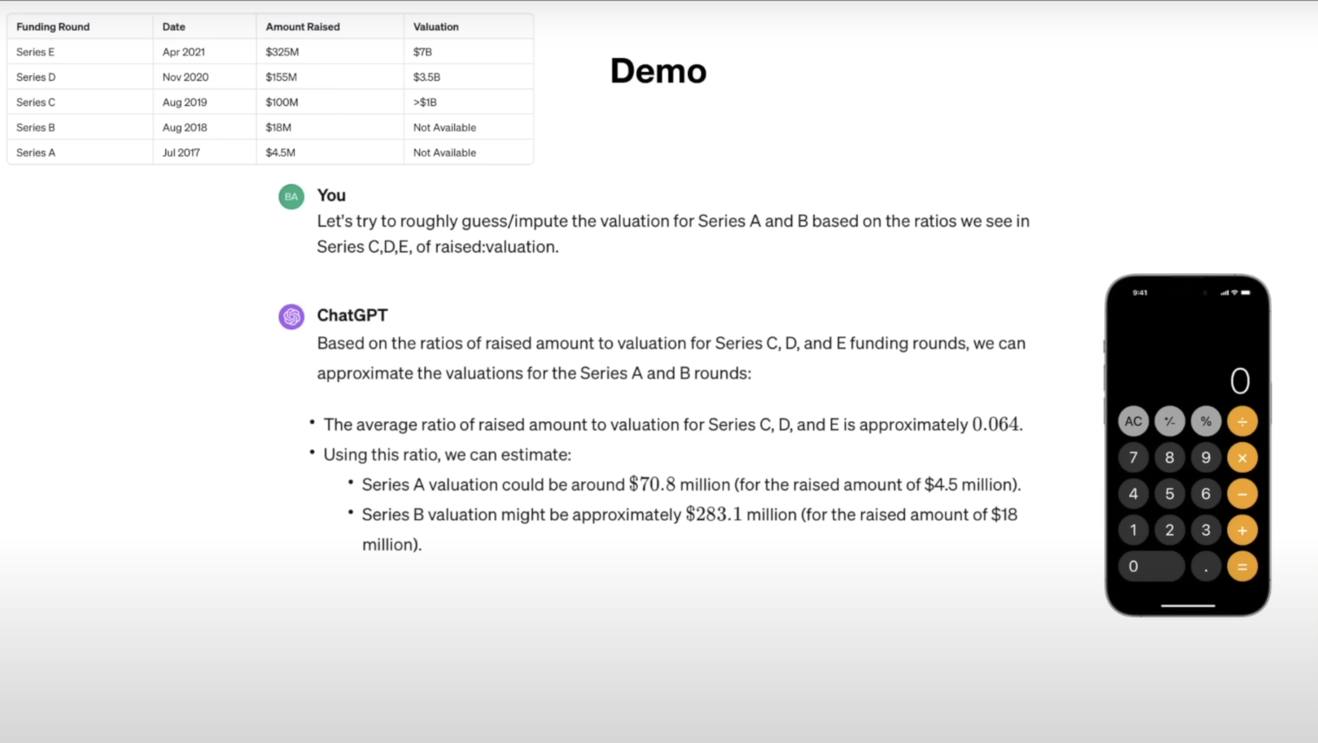 • Prompt: Let's try to roughly guess/compute the valuation for Series A and B based on the ratios we see in Series C,D,E, of raised:valuation.