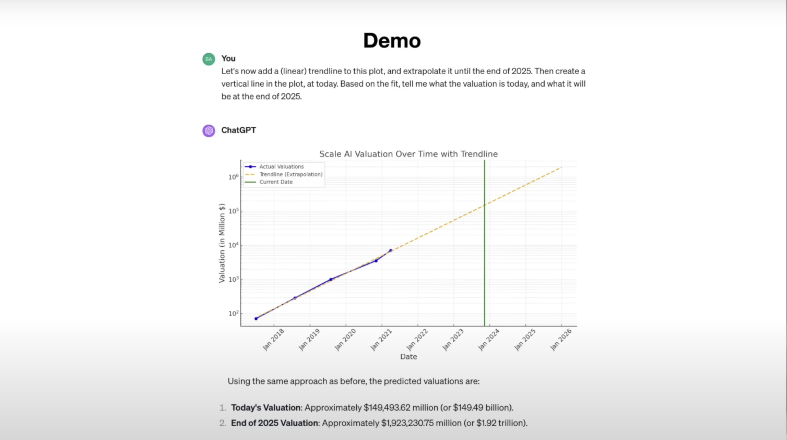 • Prompt: Let's now add a linear trendline to this plot, and extrapolate it until the end of 2025. Then create a vertical line in the plot, at today. Based on the fit, tell me what the valuation is today, and what it will be at the end of 2025.