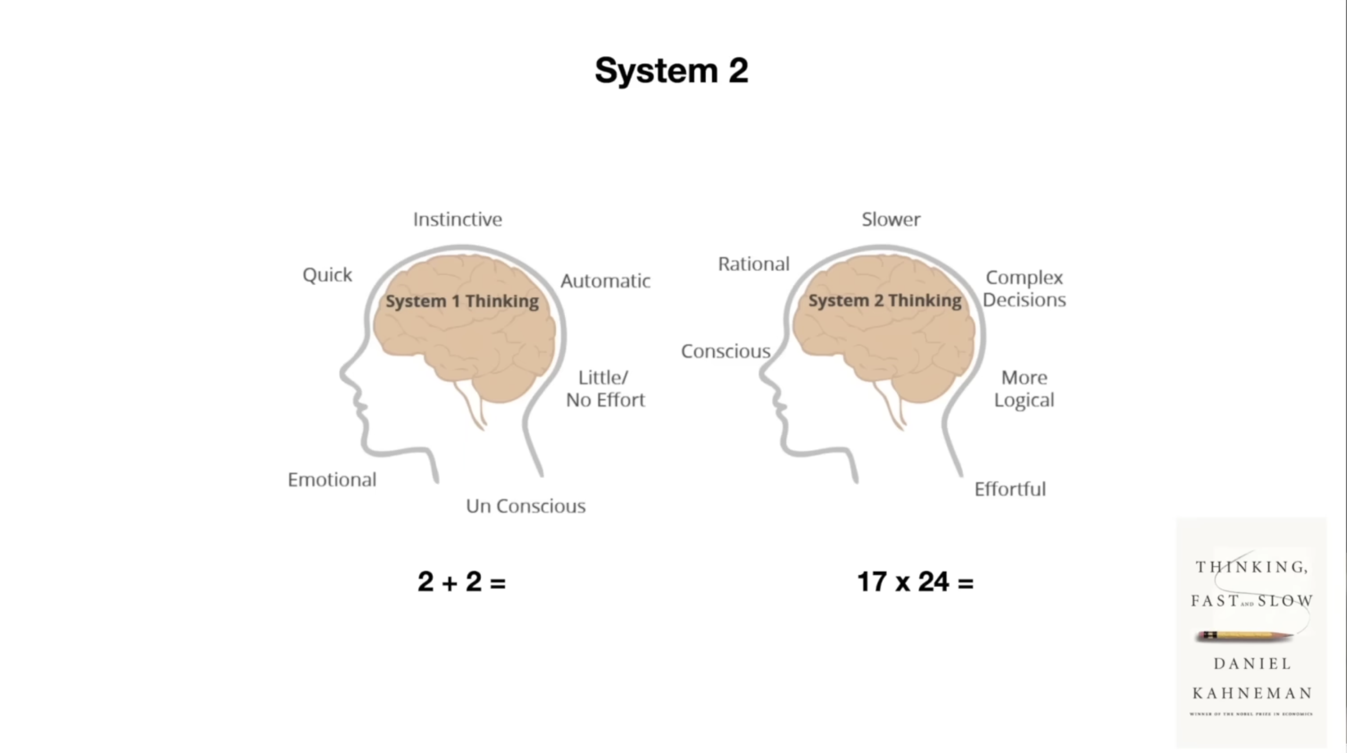 • System 2 Thinking: Conscious, Rational, Slower, Complex Decisions, More Logical and Effortful