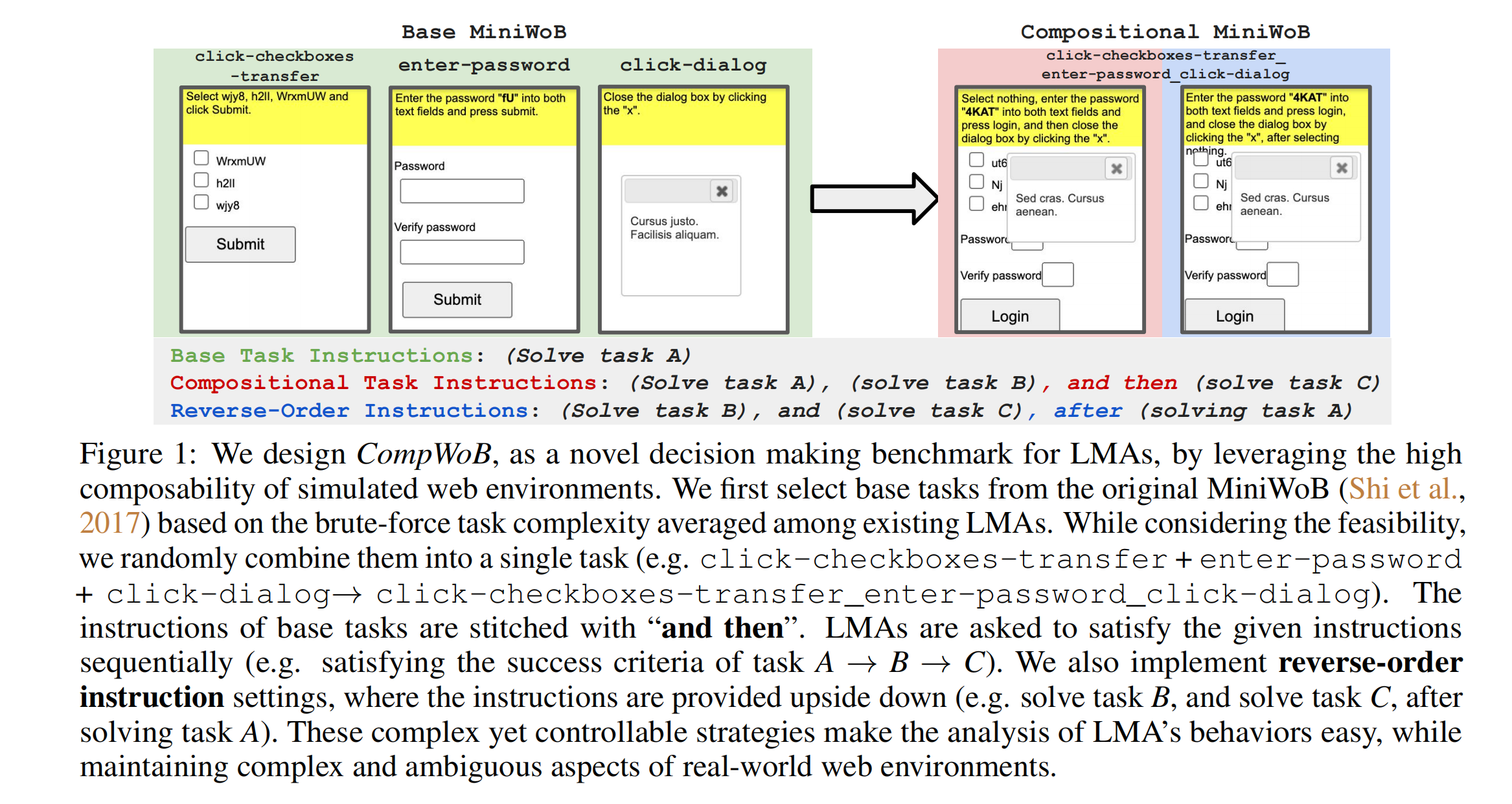 Language model agents (LMA) recently emerged as a promising paradigm on mutistep decision making tasks, often outperforming humans and other reinforcement learning agents. Despite the promise, their performance on real-world applications that often involve combinations of tasks is still underexplored. In this work, we introduce a new benchmark, called CompWoB – 50 new compositional web automation tasks reflecting more realistic assumptions. We show that while existing prompted LMAs (gpt-3.5-turbo or gpt-4) achieve 94.0% average success rate on base tasks, their performance degrades to 24.9% success rate on compositional tasks. On the other hand, transferred LMAs (finetuned only on base tasks) show less generalization gap, dropping from 85.4% to 54.8%. By balancing data distribution across tasks, we train a new model, HTML-T5++, that surpasses human-level performance (95.2%) on MiniWoB, and achieves the best zero-shot performance on CompWoB (61.5%). While these highlight the promise of small-scale finetuned and transferred models for compositional generalization, their performance further degrades under different instruction compositions changing combinational order. In contrast to the recent remarkable success of LMA, our benchmark and detailed analysis emphasize the necessity of building LMAs that are robust and generalizable to task compositionality for real-world deployment.