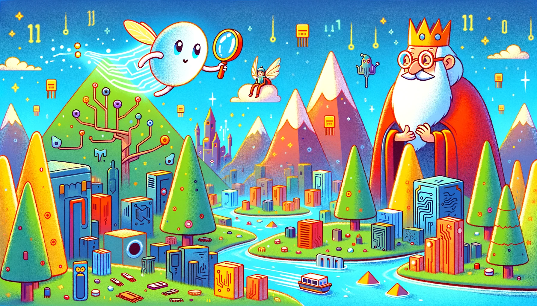 Concept for the Accompanying Image: The image could be a whimsical depiction of Agent Pixel, a tiny, luminous character with a magnifying glass, soaring over a colorful, digitized landscape representing DataTopia. The landscape would have elements like trees shaped like USB sticks, mountains resembling hard drives, and rivers flowing with binary code. In the background, King Algorithm, depicted as a wise, elderly figure with a crown shaped like a gear, watches proudly from his castle made of circuit boards.