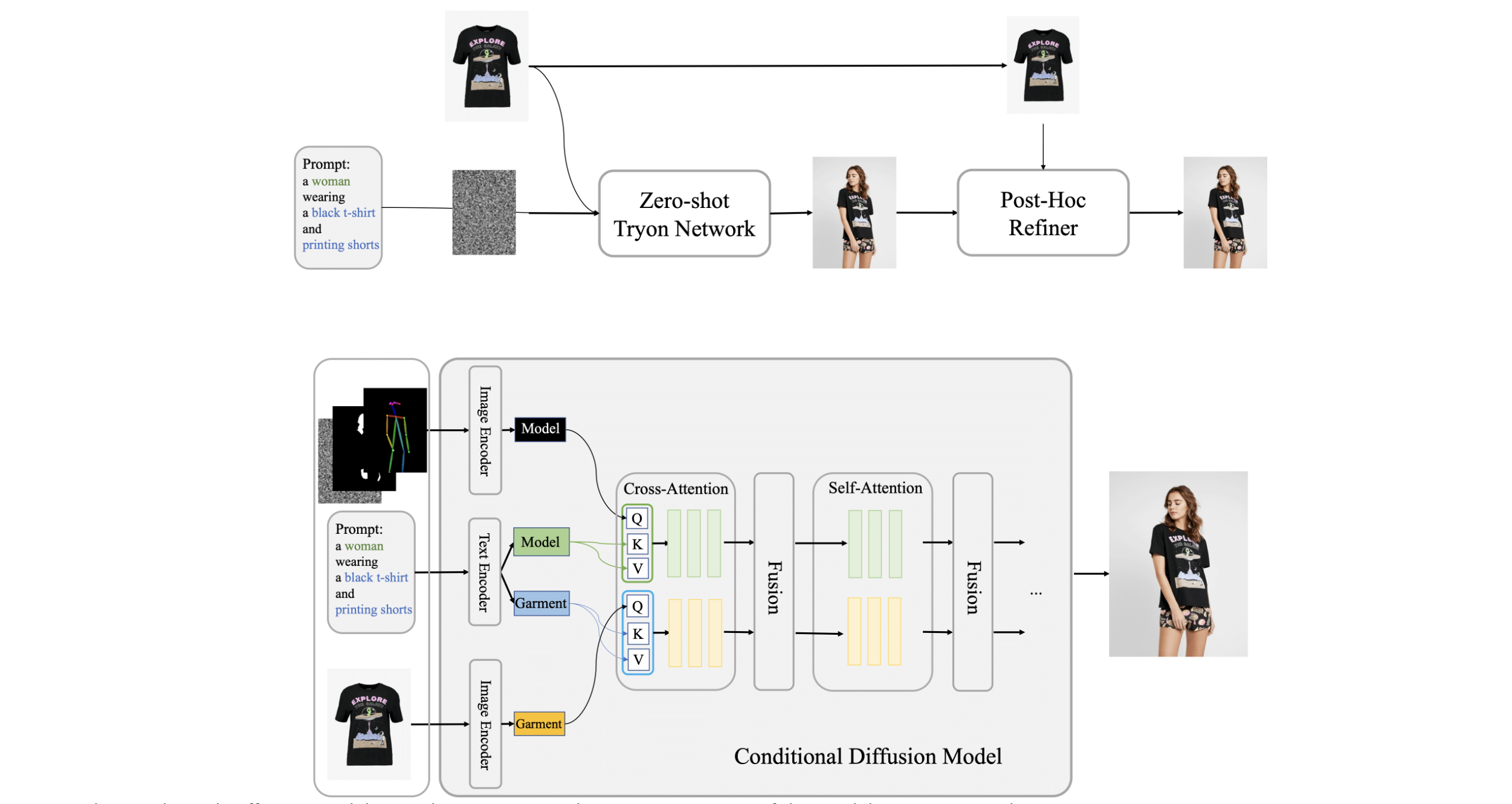 - The conditional Diffusion Model central to our approach processes images of the model, garments, and accompanying text prompts, using garment images as the control factor. Internally, the network segregates into two streams for independent processing of model and garment data. These streams converge within a fusion network that facilitates the embedding of garment details onto the model's feature representation. On this foundation, we have established Outfit Anyone, comprising two key elements: the Zero-shot Try-on Network for initial try-on imagery, and the Post-hoc Refiner for detailed enhancement of clothing and skin texture in the output images.